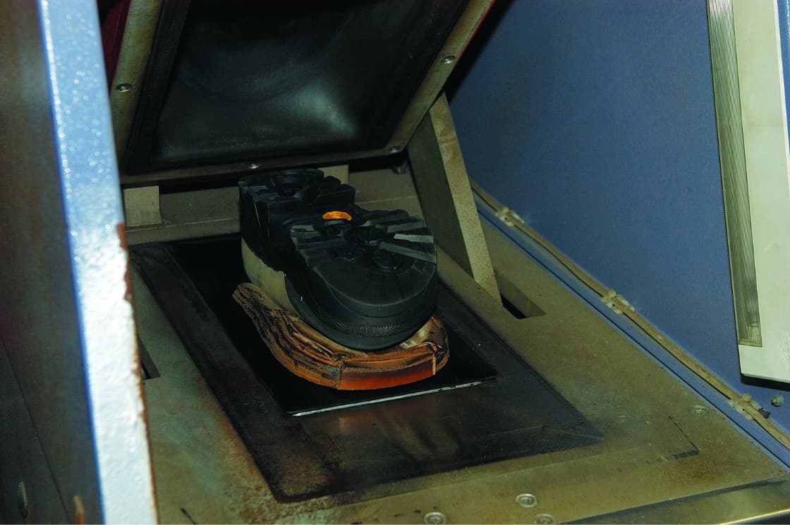 圧着機で接着。アッパーと新しいソールを完全に圧着します。